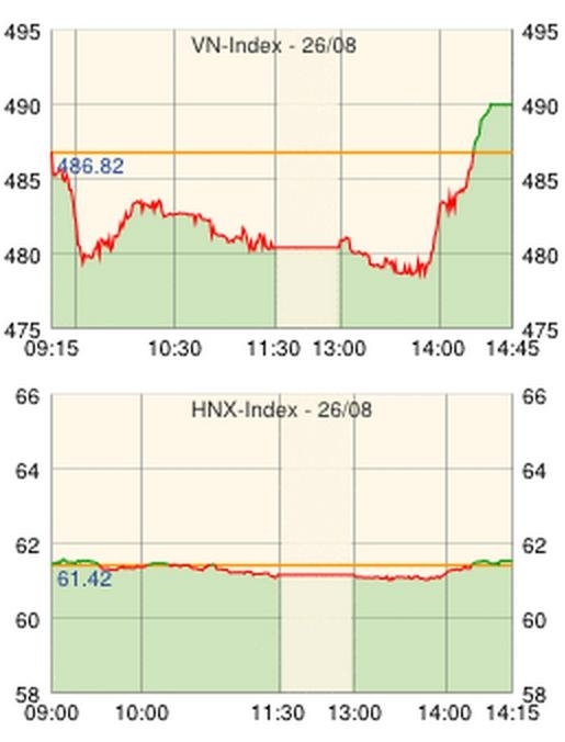ホーチミン市証券取引所の26日の取引は、マイナスで寄り付いた後急落し、480ポイントを割った。8月における全国の消費者物価指数(CPI)が前月比+0.83%となったという情報よりも、先週からのETFファンドの強い売りへの懸念から、投資家は慎重姿勢に。朝方からビナミルク[VNM]、ビングループ[VIC]、マサンインベストメントグループ[MSN]など主力株が軒並み値を下げた。後場中盤には478.59の安値を記録したが、その後、VNM株の外国人投資家枠がETFファンドからの売りで余裕ができたことで買いが集中、これが呼び水となってMSN、ホアン・アイン・ザライ[HAG]などの主力株が上昇してインデックスは急上昇、終盤で一気にプラス圏に入り、前日終値を+3.72ポイント上回る490.54ポイントで取引を終えた。