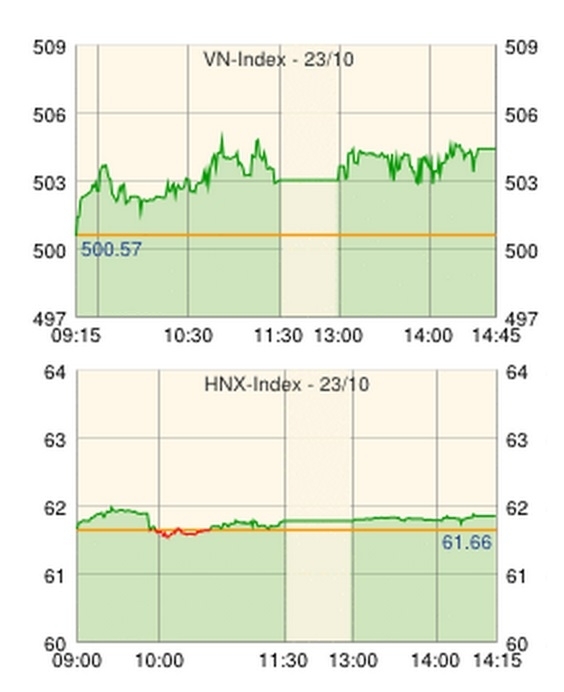 ホーチミン証券取引所の23日の取引は、前日Market Vectors Vietnam ETFが証券100万口を追加調達したため、同ファンド組み入れ銘柄の取引が活発となった。VNインデックスはプラスで寄り付いた後、バオベトグループ[BVH]、ビングループ[VIC]、キンド食品[KDC]、ジェマディプト港湾海運[GMD]などのVN30銘柄が上昇してインデックスを押し上げ、インデックスは終日プラス圏で推移した。中型株ではタンタオ不動産[ITA]がMarket Vectors Vietnam ETFの大量買いで上昇した他、ミラエ繊維[KMR]、アジアヒュウリエン鉄鋼[HLA]、タイグエン鉱業[TNT]などが大きく上昇。また、ホアン・アイン・ザライ[HAG]、+0.9%が外国人投資家に大きく買われて上昇し、インデックスは前日終値を+3.48ポイント上回る504.05ポイントで取引を終えた。