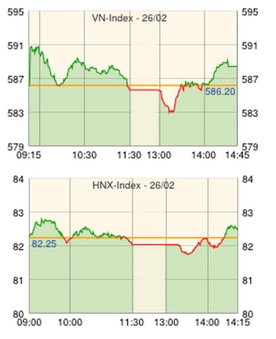 ホーチミン証券取引所の26日の取引は、プラスで寄り付き590ポイントを超える高値を付けた後、マサンインベストメントグループ[MSN]、ビナミルク[VNM]の大型株が一時値を下げたことでインデックスがマイナス圏に転落する場面もあった。だが、ホアン・アイン・ザライ[HAG]、FPT情報通信[FPT]、ペトロベトナム運輸[PVT]などの主力株が大きく上昇してインデックスを牽引し、前日終値を+3.61ポイント上回る589.81で3日続伸となった。