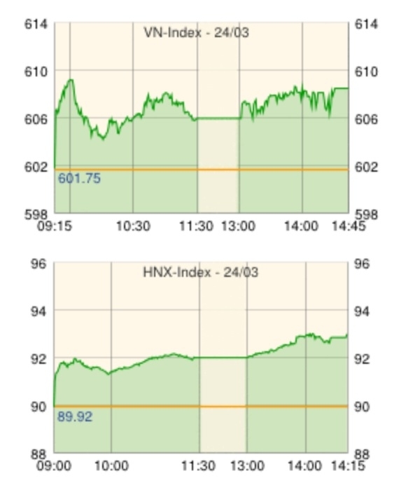 ホーチミン証券取引所の24日の取引は、プラスで寄り付いた後、609.2まで上昇。加熱への警戒から若干値を下げたものの、小刻みな値動きでプラス圏を推移し、先週終値を+5.80ポイント上回って続伸した。特に、タンタオ不動産[ITA]、ホアンクアン不動産商業コンサルティング[HQC]、FLCグループ[FLC]がこの日最も取引されて上昇。そのほか、DIC投資貿易[DIC]、技術インフラ開発[IJC]、ブンタウ不動産建設[VRC]、オーシャンインベストメントグループ[OGC]など、不動産・建設関連が活発に取引されて大きく上昇した。