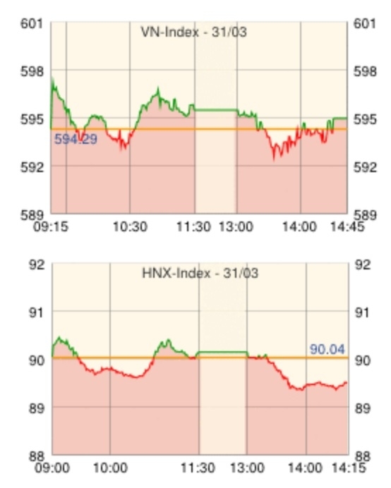 ホーチミン証券取引所の31日の取引は、プラスで寄り付き、朝方急上昇したもののすぐ下落、前日終値をはさんで値動きする展開に。後場では終盤に向かってプラス圏に回復したが、引け間際で下落。前営業日終値を▲2.72ポイント下回る591.57で取引を終えた。主力株ではキンド食品[KDC]が大きく値を上げたが、オーシャンインベストメントグループ[OGC]、技術インフラ開発[IJC]が下落。また、アンズオンタオディエン不動産商業投資[HAR]、FLCグループ[FLC]、タンタオ不動産[ITA]など不動産・建設関連の下げが目立った。