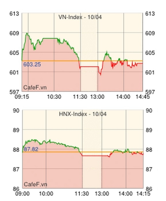 ホーチミン証券取引所の10日の取引は、プラスで寄り付いた後、朝方からペトロベトナムガス[GAS]が大きく上昇してインデックスを牽引して608.89の高値をつけ、前場は大きくプラスで推移していたものの、前引けで急落しマイナスに。GASが値を下げ戻したほか、主力株のキンド食品[KDC]、ビナミルク[VNM]、ホアセン鉄鋼グループ[HSG]が値を下げ、前日終値を▲1.92ポイント下回って反落した。この日最も取引されたタンタオ不動産[ITA]は若干値を下げたが、FLCグループ[FLC]は若干の上昇。サイゴン証券[SSI]が前営業日に引き続き活発に取引されて値を上げたほか、ホーチミン市インフラ投資[CII]、トゥアンタオ[GTT]、クオッククオン・ザライ[QCG]が上昇した。