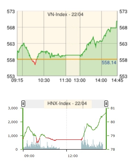 ホーチミン証券取引所の22日の取引は、この2日間の大幅下げから一転プラスで寄り付き、朝方上値を試したあと一旦マイナスに転落したが、すぐに回復し、後場は終盤に向かって大きく上昇。前日終値を+11.73ポイント上回る570目前で高値引けし、大幅反発した。VN30銘柄はほぼ全面高で、ホアファット鉄鋼グループ[HPG]、サイゴン証券[SSI]、オーシャンインベストメントグループ[OGC]、技術インフラ開発[IJC]などが大きく上昇。また、この日最も活発に取引されたタンタオ不動産[ITA]をはじめ、FLCグループ[FLC]、ホアンクアン不動産商業コンサルティング[HQC]、ホアン・アイン・ザライ[HAG]などの不動産株が牽引した。