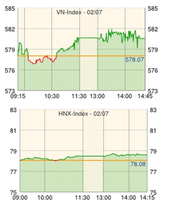 ホーチミン証券取引所の2日の取引は、投資家の心理が安定し、前日の売買高を維持した。ビナミルク[VNM]とマサンインベストメントグループ[MSN]がインデックスを牽引して一時581.89まで上昇したものの、上値は重く、ペトロベトナムガス[GAS]下げが影響して、前日終値を+0.73上回る578.80で取引を終えた。この日最も取引されFLCグループ[FLC]や、キンバックシティーグループ[KBC]、アンズオンタオディエン不動産商業投資[HAR]などの不動産株が活発に取引されて上昇。また、チャファコ製薬[TRA]とイメックスファーム医薬品[IMP]の製薬銘柄が突如上昇してストップ高に。一方、ビナカフェ・ビエンホア[VCF]が前日に続き大きく値を下げた。外国人投資家は売買高ベースで5月23日以来の売り越しとなった。