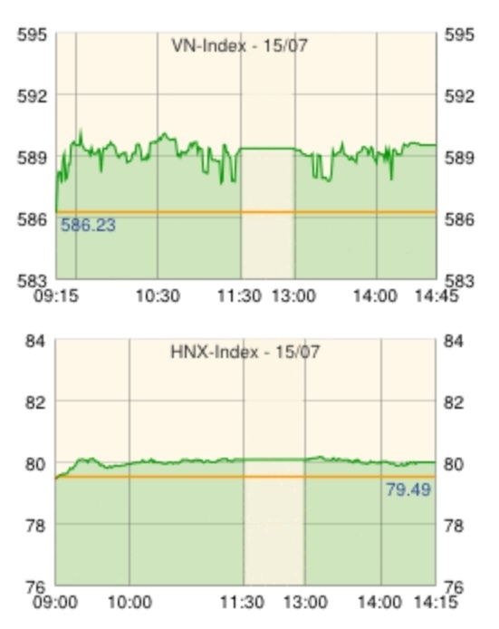 ホーチミン証券取引所の15日の取引は、プラスで寄り付き、ワールドカップ決勝日明けにあたった前日とは打って変わり、売買高は前日比+57%増。但し、一時590を超えたものの上値重く、前日終値を+3.08ポイント上回る589.31で取引を終えた。主力株では、ビナミルク[VNM]、ホアファット鉄鋼グループ[HPG]、ホーチミン市証券[HCM]、ホーチミン市インフラ投資[CII]などが上昇。この日売買高最多のFLCグループ[FLC]やタンタオ不動産[ITA]が値を上げた。また、前日上場した携帯端末販売大手のテーゾイジードン投資[MWG]は投資家が依然様子見で売買高は少なかったもののストップ高に。8日に上場し3営業日ストップ高となった後前日値を下げていたスーパードン-キエンザン高速船[SKG]も、再びストップ高となった。