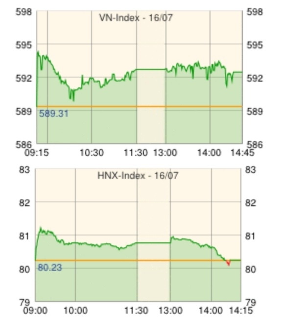 ホーチミン証券取引所の16日の取引は、南シナ海に設置されていた中国の掘削リグが沖合いに移動したことを受け、越中対立緊張緩和への期待が広がり、寄付きから590超え。活発な取引でプラス圏を維持したが、終盤で若干値を下げ戻し、前日終値を+0.37上回る小幅な上昇で3日続伸した。大型株のマサンインベストメントグループ[MSN]が上昇してインデックスを押し上げたが、ペトロベトナムガス[GAS]、カスミナタイヤ[CSM]、ダナンゴムタイヤ[DRC]は下落。この日最も取引されたFLCグループ[FLC]は若干上昇したが、第2四半期の業績が赤字だったサコム開発投資[SAM]とアグリバンク証券[AGR]が利益確定売りで値を下げた。14日に上場した携帯端末販売大手のテーゾイジードン投資[MWG]は引き続きストップ高となった。