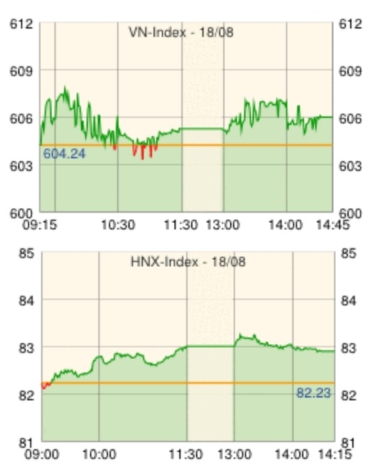 ホーチミン証券取引所の18日の取引は、先週末に海外投資家の売り圧力が緩和されたことを受け国内投資家の心理も改善し、活発な取引に。ペトロベトナム総合サービス株式公社[PET]やペトロベトナム運輸[PVT]が値を上げたほか、8月時点で証券銘柄中唯一業績目標を達成しているサイゴン証券[SSI]を筆頭に証券株が上昇してインデックスを押し上げ、前日終値を0.84上回る605.08で取引を終えた。ペトロベトナム関連では、ペトロベトナム工業・住宅建設[PXI]、ペトロベトナム設備組立・鉄鋼構造物[PXS]、PVCペトロランド[PTL]も上昇。一方、ペトロベトナム・ドリリング[PVD]が値を下げたほか、海外投資家による大型の相対取引が行われたビナミルク[VNM]が下落。テーゾイジードン投資[MWG]は前週からの上昇傾向を維持した。