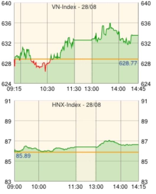ホーチミン証券取引所の28日の取引は、前日に外国人投資家が売り越したことで国内投資家が慎重姿勢となり、マイナスで寄り付き、前場は前日終値を挟んで大きく値動きしたが、ホアン・アイン・ザライ[HAG]、ビングループ[VIC]を中心に海外投資家の買いが強まると、国内投資家の心理が改善してインデックスは大きく上昇。前日終値を+3.26ポイント上回る632.03で反発した。大型株のペトロベトナムガス[GAS]が上昇してインデックスを牽引したほか、ダナンゴムタイヤ[DRC]、FPT情報通信[FPT]、ホアセン鉄鋼グループ[HSG]が上昇。また、ベトナム郵政通信グループ (VNPT)が放出したと思われるサコム開発投資[SAM]株が活発に取引されてストップ高。経営陣が一新したハナム鉱産株式公社[KSH]は11営業日連続のストップ高を記録した。一方、ペトロベトナム低圧ガス販売[PGD]、ビングループ[VIC]、ホアファット鉄鋼グループ[HPG]、キンド食品[KDC]、ビナミルク[VNM]は値を下げた。