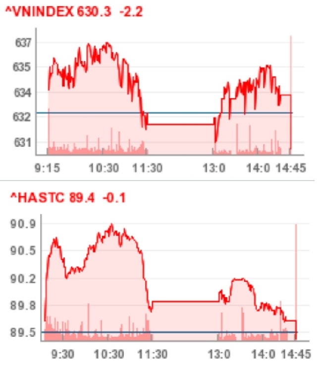 | VN指数 | 630.34 | -2.16 | -0.34 |