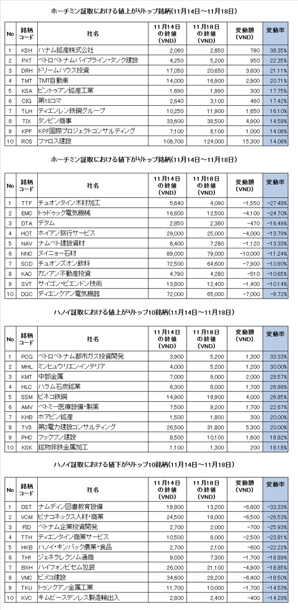 ベトナム株情報 > ベト株ニュース > 市場概況 > 株価変動週間トップ10(11月14日~11月18日)