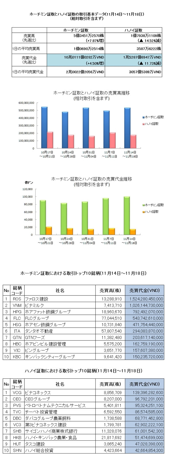 ベトナム株情報 > ベト株ニュース > 市場概況 > 市場全体の週間取引トップ10(11月14日~11月18日)