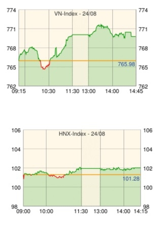 ホーチミン市場は買い先行で766.48 (+0.07%)で寄り付いた後、マイナス圏に転落する局面もあったが、前場の中盤にかけて主にプラス圏でもみ合った。その後は前引けにかけて値を上げ、後場に入るとさらに上げ幅を拡大、771.65 (+0.74%)まで上昇する局面もあった。その後は引けにかけて若干値を消し、VNインデックスは+3.79ポイント(+0.49%)高の769.77で引けた。