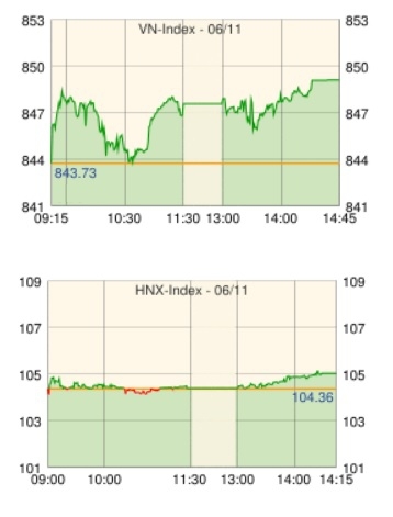 ホーチミン市場は買い先行で846.12 (+0.28%)で寄り付いた後、一気に値を上げ、848.10 (+0.52%)まで上昇すると失速、もみ合いながら値を消す展開となった。マイナス圏に転落寸前で再び上昇に転じ、前引けにかけて値を上げた。後場に入ると、もみ合いながら更に上げ幅を拡大し、引け際に押し目狙いの買いが入ったことで一段高となり、VNインデックスは+5.36ポイント(+0.64%)高の849.09の高値で引けた。