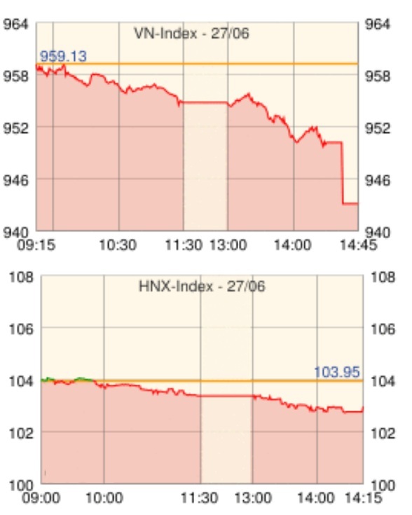 | HNX指数 | 102.96 | -0.99 | -0.96 |