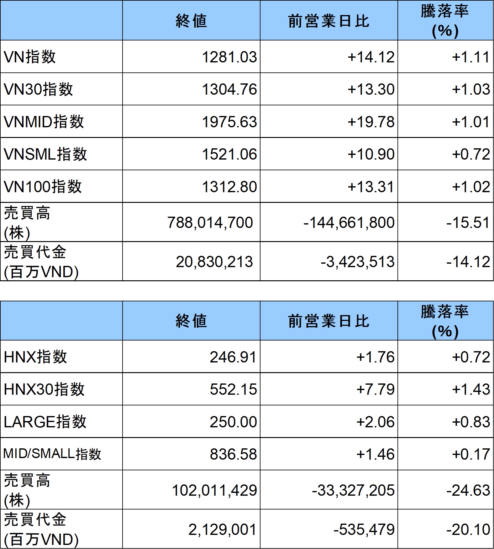 売買代金は2兆1290億VND(約131億円)、前日比▲20.1%減少した。主力株は値上がり銘柄が多く、インデックスをけん引した。
