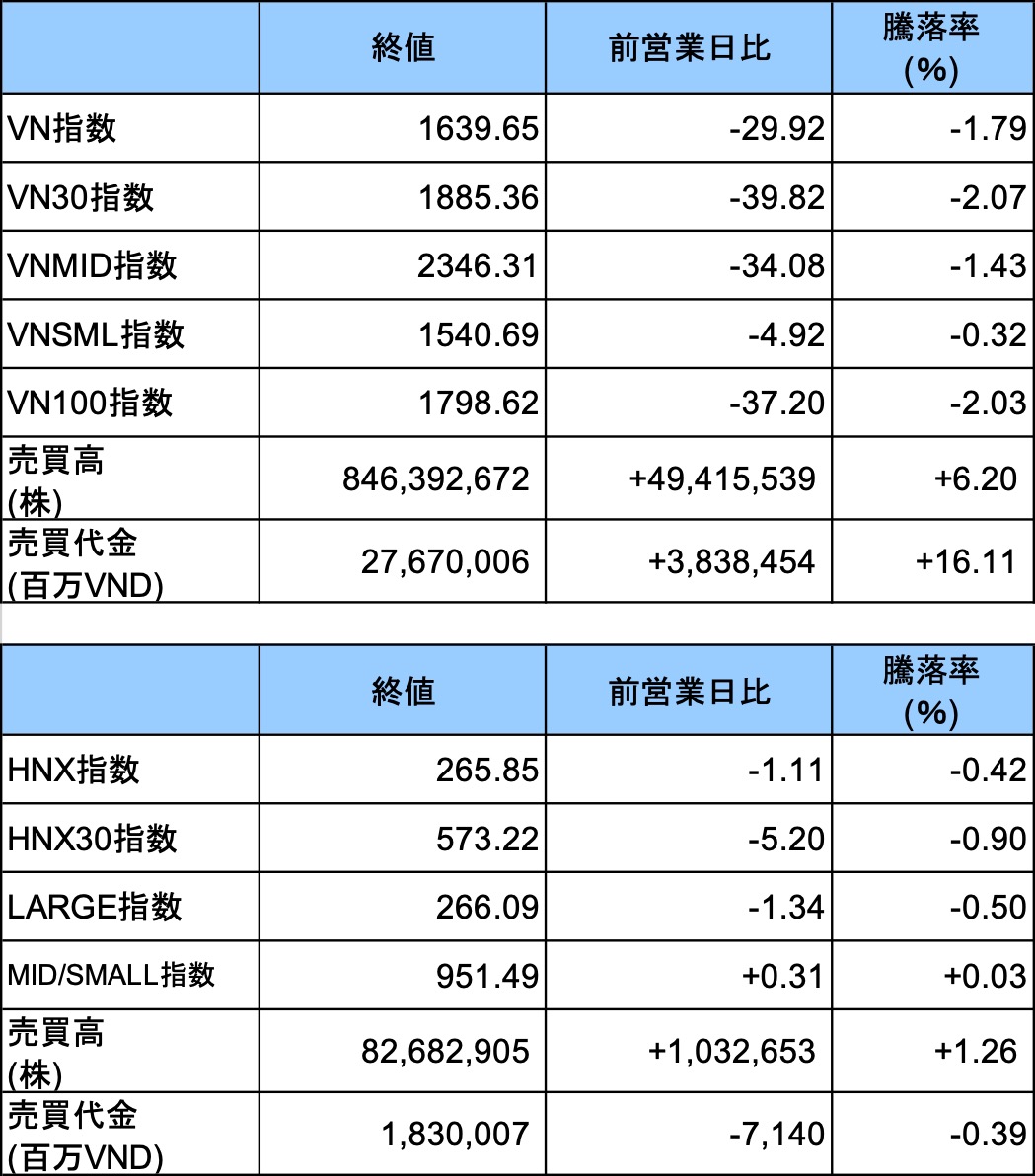 売買代金は27兆6700億VND(約1600億円)、前日比+16.1%増加した。主力株は値下がり銘柄が多く、インデックスの重しになった。