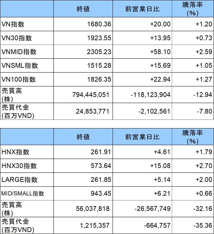 売買代金は24兆8538億VND(約1470億円)、前日比▲7.8%減少した。主力株は値上がり銘柄が多く、中でもビンパール[VPL]がストップ高し、インデックスをけん引した。