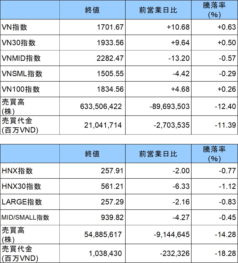 売買代金は21兆0417億VND(約1240億円)、前日比▲11.4%減少した。主力株は値上がり銘柄が多く、インデックスをけん引した。