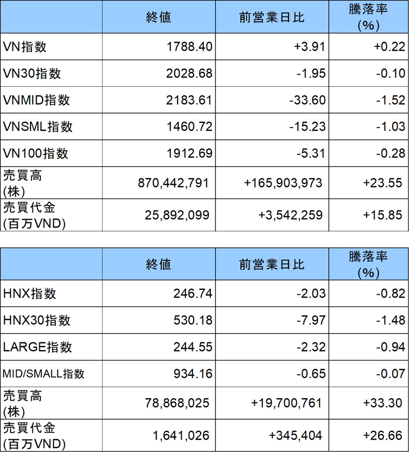 ホーチミン市場は1787.13 (+0.15%)で寄り付いた後、値を上げた。1797.40 (+0.72%)まで上昇すると失速、マイナス圏に下落した。1775.19 (+0.52%)まで下落すると反発、前引けにかけて値を上げる展開となった。後場に入ると上げ幅を拡大したが、中盤には再び失速、引けにかけて一進一退で方向感のない取引が続き、VNインデックスは+3.91ポイント(+0.22%)高の1788.40で引けた。