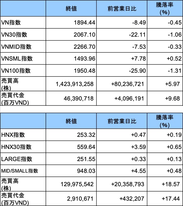 売買代金は46兆3907億VND(約2800億円)、前日比+9.7%増加した。主力株は値下がり銘柄が多く、インデックスの重しになった。