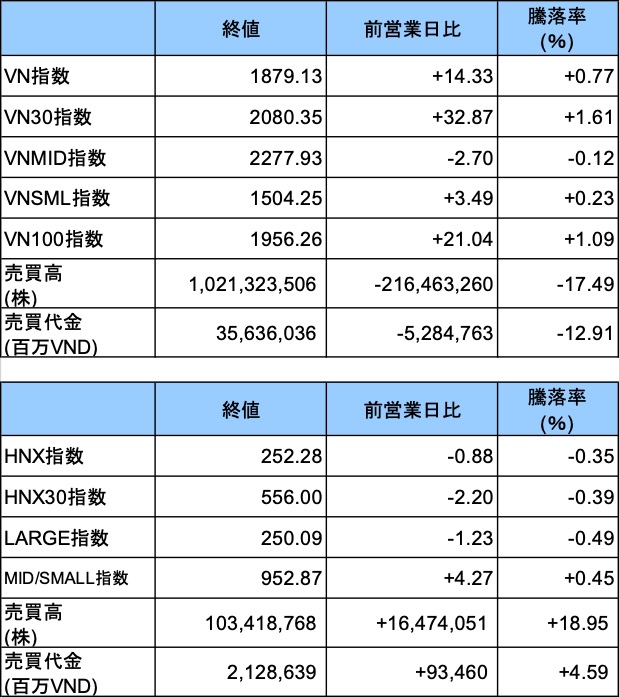 売買代金は35兆6360億VND(約2150億円)、前日比▲12.9%減少した。主力株は値上がり銘柄が多く、中でもFPT情報通信[FPT]がストップ高し、インデックスをけん引した。
