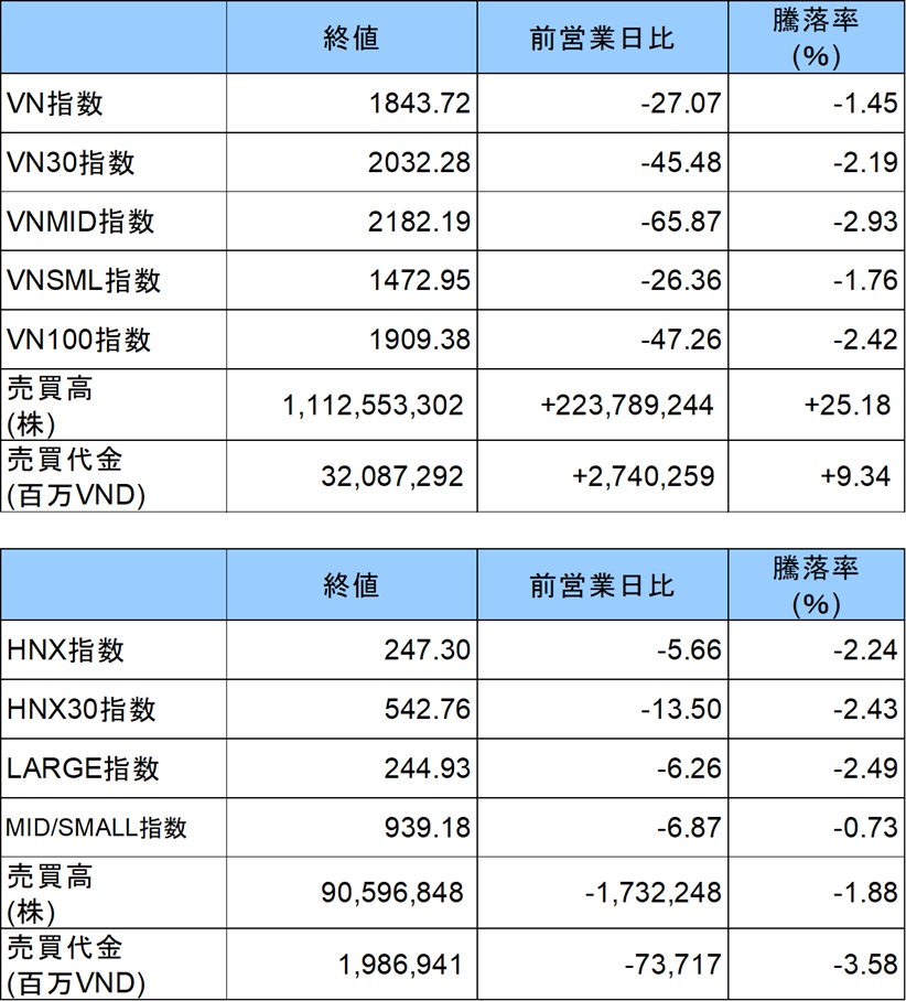 売買代金は32兆0873億VND(約1900億円)、前日比+9.3%増加した。主力株は値下がり銘柄が多く、インデックスの重しになった。