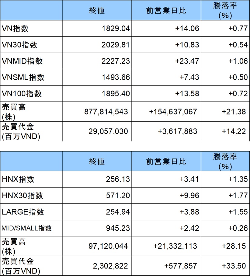 売買代金は29兆0570億VND(約1720億円)、前日比+14.2%増加した。主力株は値上がり銘柄が多く、インデックスをけん引した。