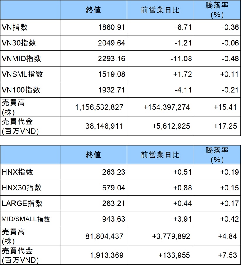 売買代金は38兆1489億VND(約2270億円)、前日比+17.3%増加した。主力株はまちまちだった。