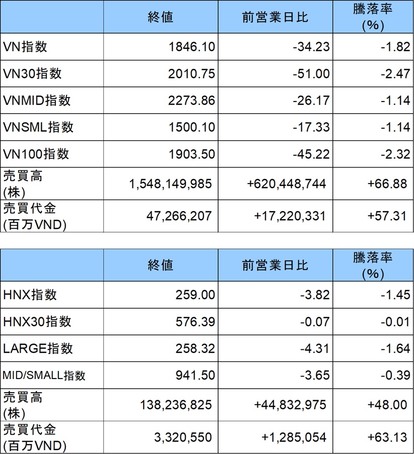 ホーチミン市場は1876.01 (+0.23%)で寄り付いた後、一時値を下げた。1844.25 (▲1.92%)まで下落すると反発、前引けにかけて下げ幅を縮小する展開となった。後場に入ると売りが入ったことで再び値を下げ、引けにかけて下げ幅を拡大し、VNインデックスは▲34.23ポイント(▲1.82%)安の1846.10で引けた。