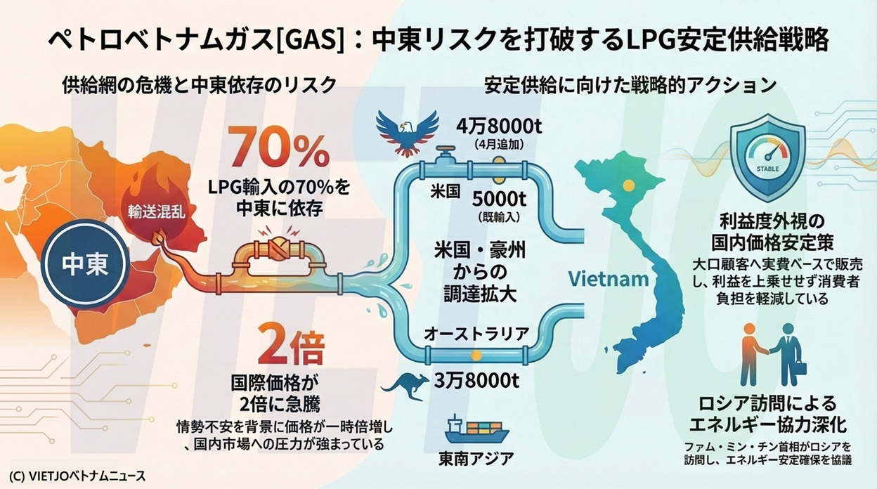 中東地域はこれまでベトナムのLPG輸入量の約70%を占めていたが、ホルムズ海峡の輸送混乱リスクなどにより、LPGの国際価格が一時2倍に跳ね上がるなど、世界的なエネルギー供給網が脅かされている。これを受け、GASは米国やオーストラリア、東南アジアなどからの調達にシフトしている。