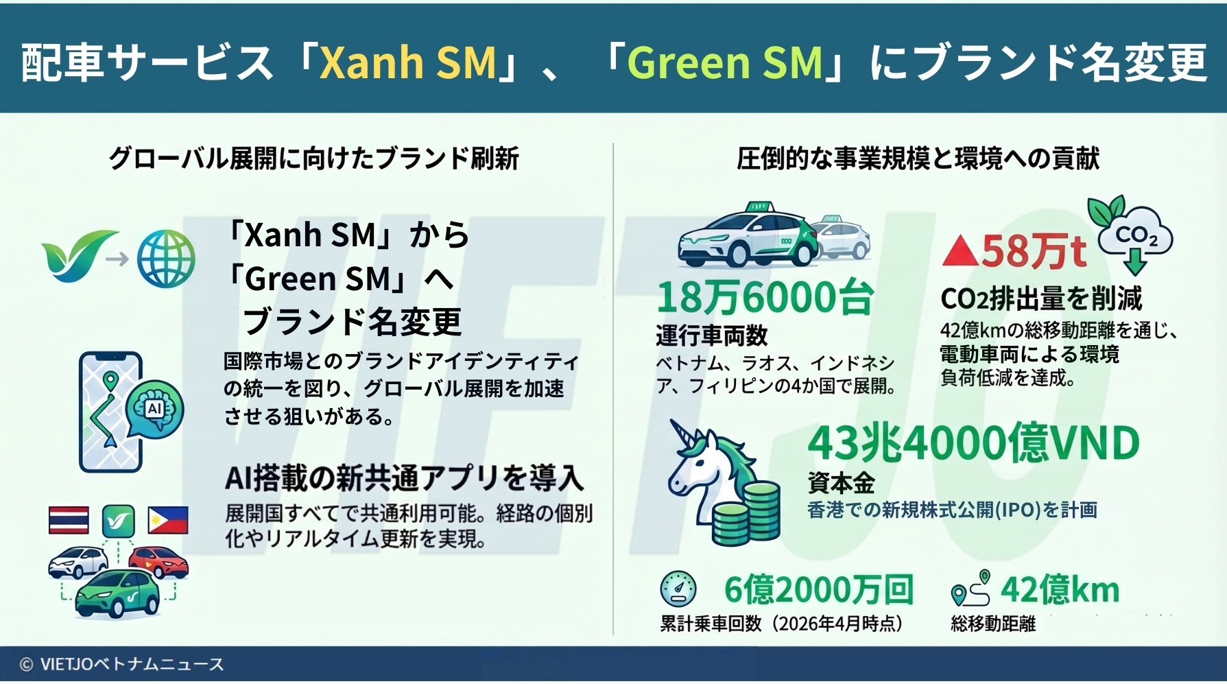 不動産開発を中核とする民間複合企業ビングループ[VIC](Vingroup)傘下のビンファスト(VinFast)製電気自動車(EV)・電動バイクのレンタカー・タクシー会社で、配車サービス「サインSM(Xanh SM)」を展開するグリーンSM(Green SM)は13日、ブランド名を英語名の「グリーンSM」に統一したと発表した。