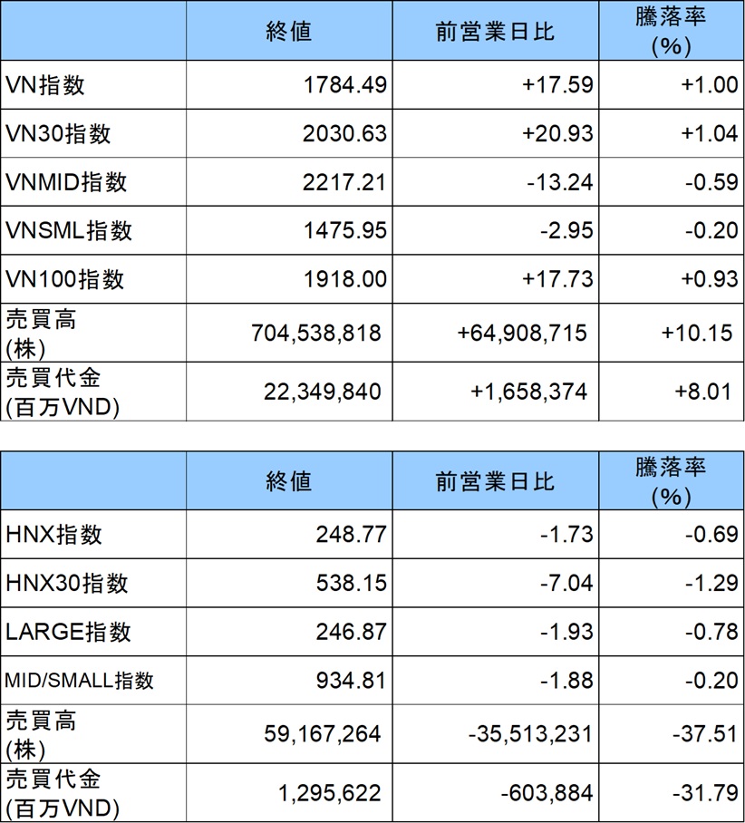 売買代金は22兆3498億VND(約1330億円)、前日比+8.0%増加した。主力株はまちまちだったが、値上がり銘柄ではHDバンク[HDB]がストップ高寸前、ビンホームズ[VHM]、ビングループ[VIC]、ビンパール[VPL]が大幅高し、インデックスをけん引した。