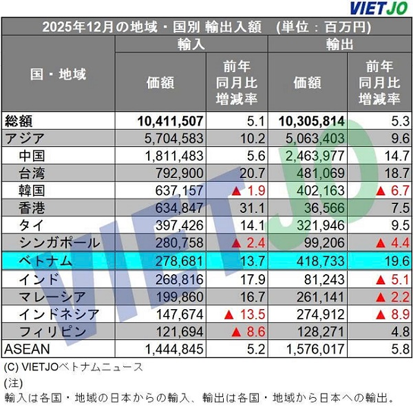 日本の財務省が発表した2025年12月の貿易統計(速報)によると、ベトナムの対日貿易収支は前年同月比+33.3%増の1400億5200万円の黒字だった。