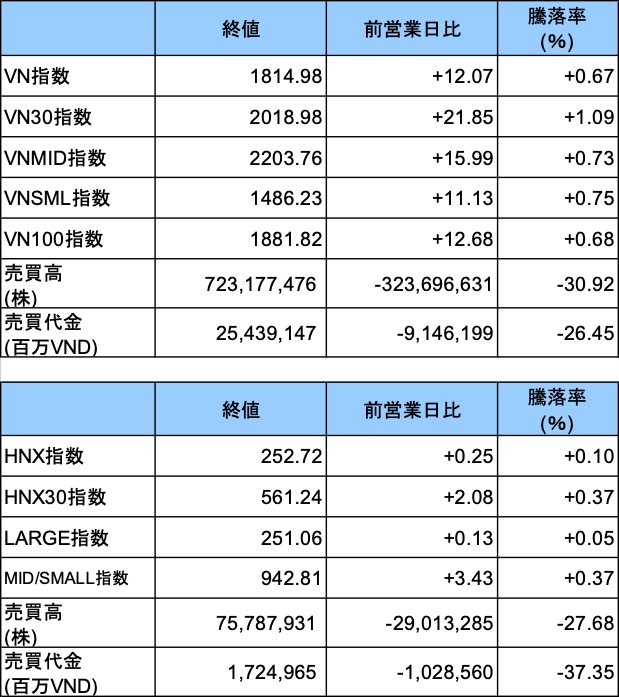 売買代金は25兆4391億VND(約1500億円)、前日比▲26.4%減少した。主力株は値上がり銘柄が多く、インデックスをけん引した。