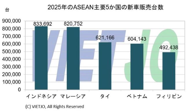 2025年におけるASEAN主要5か国の新車販売台数の統計によると、ベトナムの新車販売台数は60万4143台となり、東南アジアで4番手をキープした。3位タイとの差が約1万7000台まで縮小し、トップ3浮上が見えてきた。