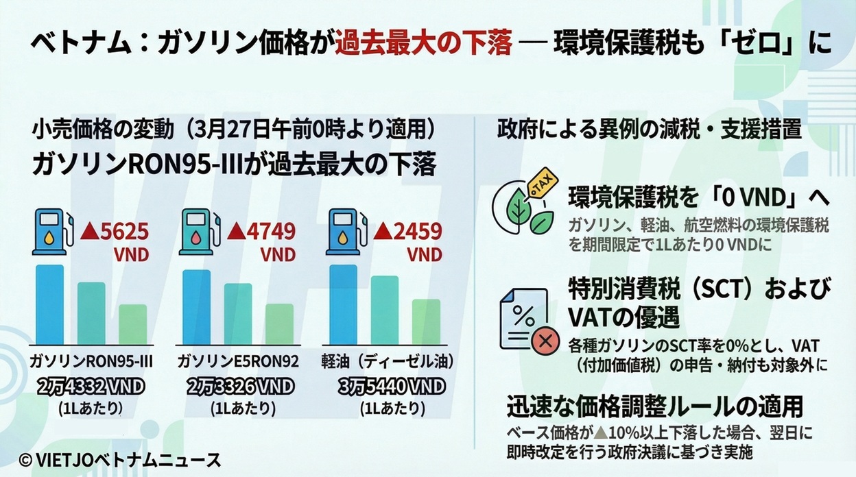 ファム・ミン・チン首相は26日、国益のために必要な場合におけるガソリン・石油および航空燃料への税率適用に関する首相決定第482号/QD-TTgを公布した。これにより、3月27日0時から4月15日まで、ガソリン(エタノールを除く)、軽油、航空燃料に対する環境保護税が1L当たり0VNDに引き下げられる。