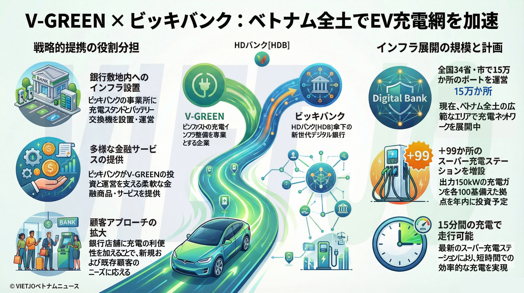 不動産開発を中核とする民間複合企業ビングループ[VIC](Vingroup)傘下の電気自動車(EV)メーカーであるビンファスト(VinFast)のEV充電インフラ整備を手掛けるV-GREENグローバル充電スタンド開発会社(V-GREEN)と、新世代のデジタルバンクであるビッキデジタル銀行(ビッキバンク=Vikki Bank)は1日、充電ステーションとバッテリー交換キャビネットのインフラ開発に関する戦略的提携を発表した。