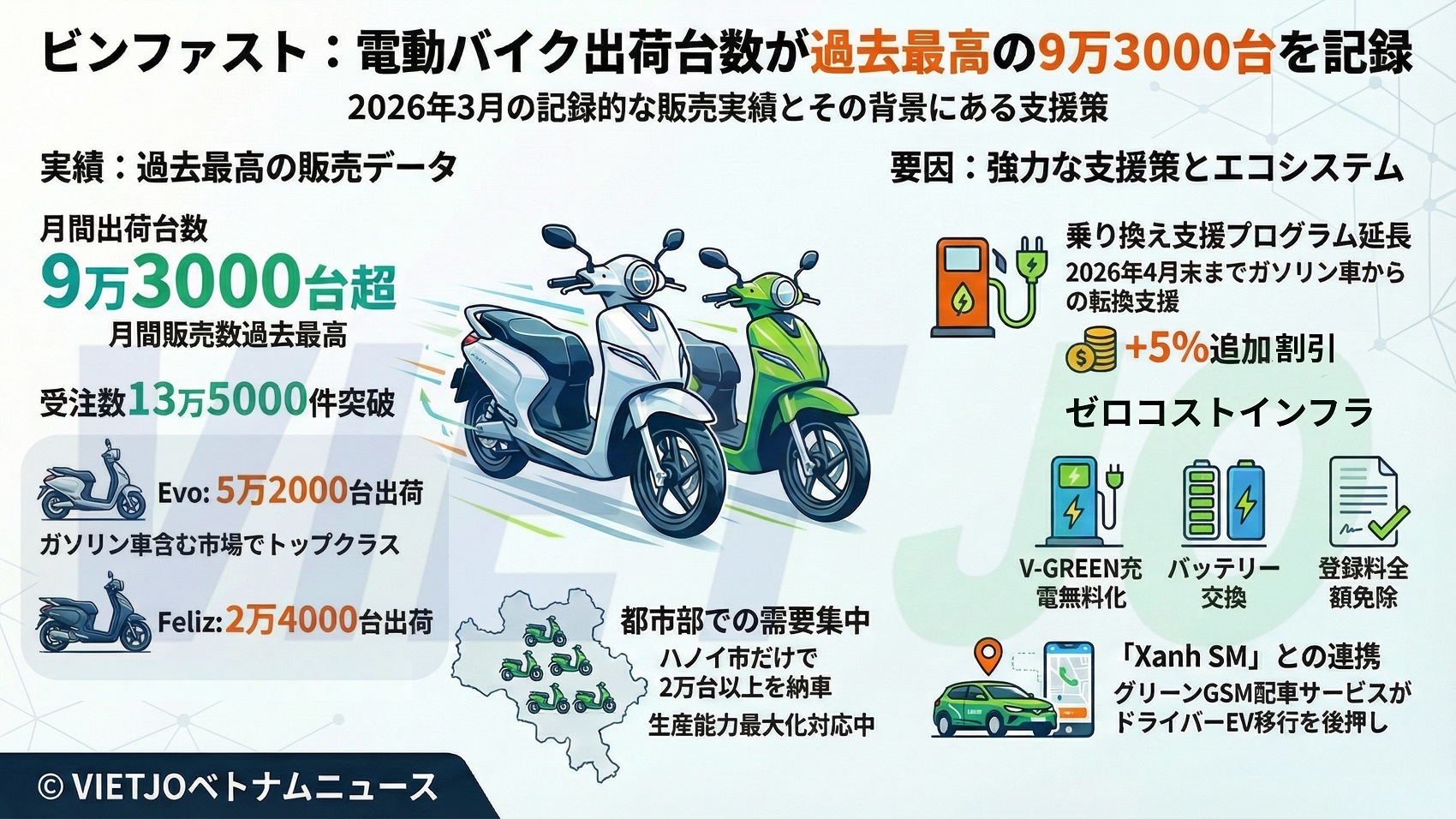 不動産開発を中核とする民間複合企業ビングループ[VIC](Vingroup)傘下の電気自動車(EV)メーカーであるビンファスト(Vinfast)は、2026年3月に13万5000台以上の注文を受け、電動バイク9万3000台以上を出荷し、月間販売数で過去最高を記録した。これは国内のグリーンな交通手段への需要の高まりを示している。
