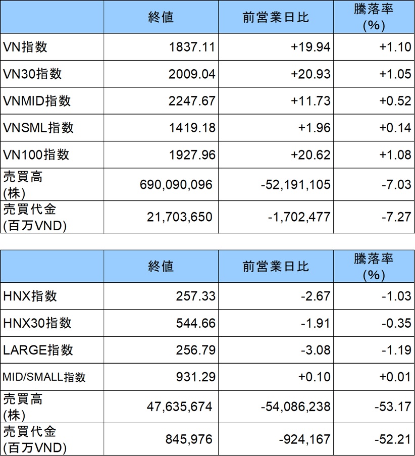 VNインデックスは1837.11ポイントで取引を終え、前日比+19.94ポイント(+1.10%)と大幅に上昇した。ただし、市場全体の流動性は低下傾向にあり、売買代金は21兆7036億VND(約1300億円)に留まった。一方、HNXインデックスは257.33ポイントで、前日比▲2.67ポイント(▲1.03%)と反落した。売買代金は8459億VND(約51億円)であった。