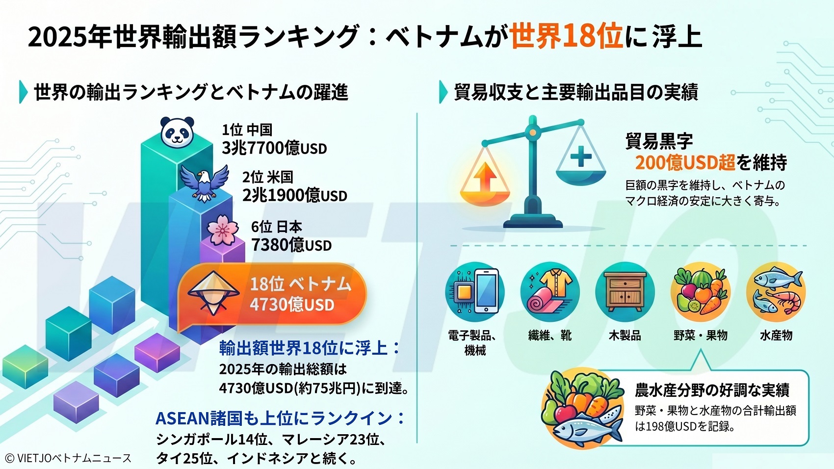 世界貿易機関(WTO)の最新データに基づく2025年における世界の輸出額上位30か国・地域のランキングで、ベトナムは輸出額4730億USD(約75兆円)となり、世界18位にランクインした。前年は世界21位だった。