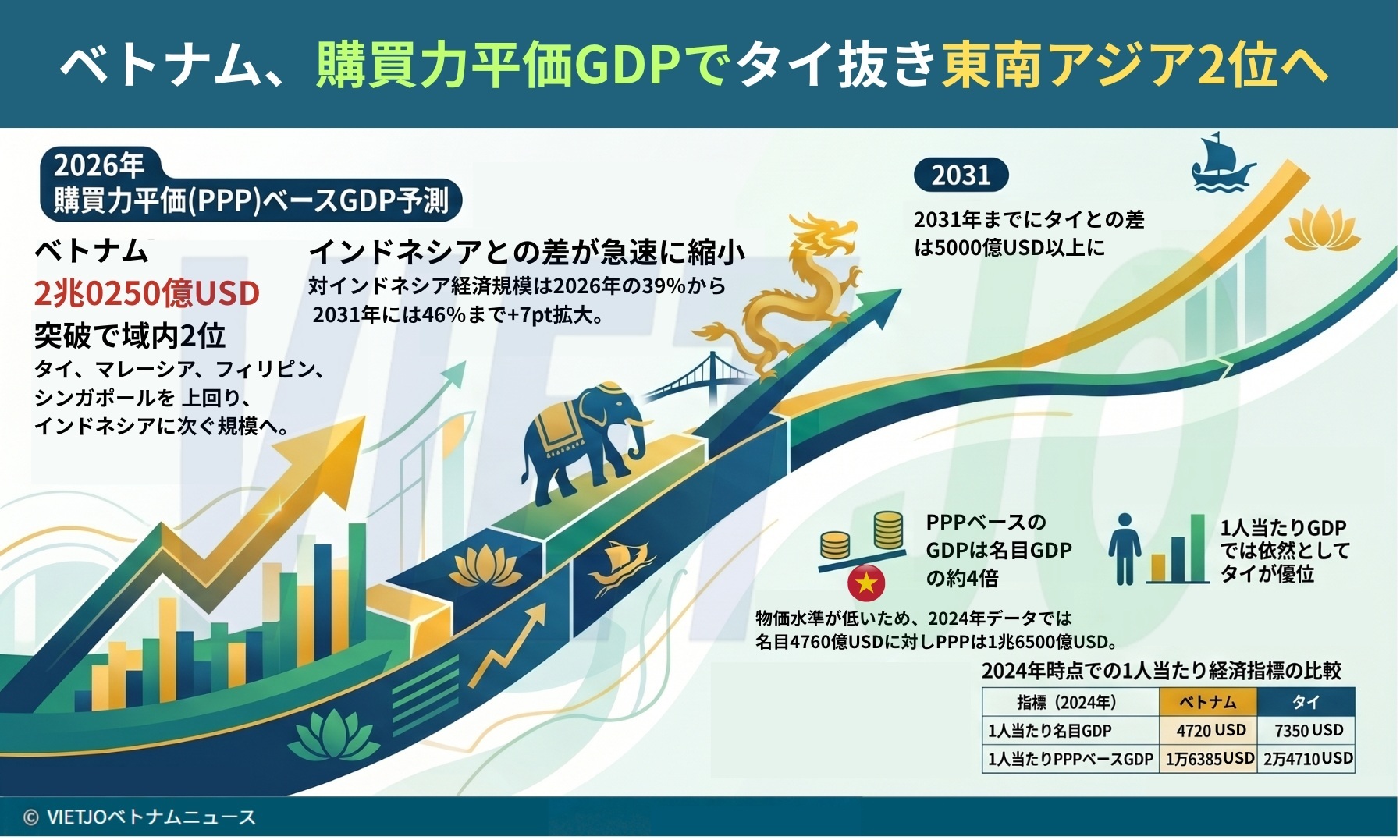 2031年までにベトナムとタイの差はさらに広がり、ベトナムがタイを5000億USD(約80兆円)以上上回る見込みとなっている。また、首位のインドネシアに対するベトナムの経済規模は、2026年の約39%から2031年には約46%まで拡大し、差を急速に縮めると予測されている。