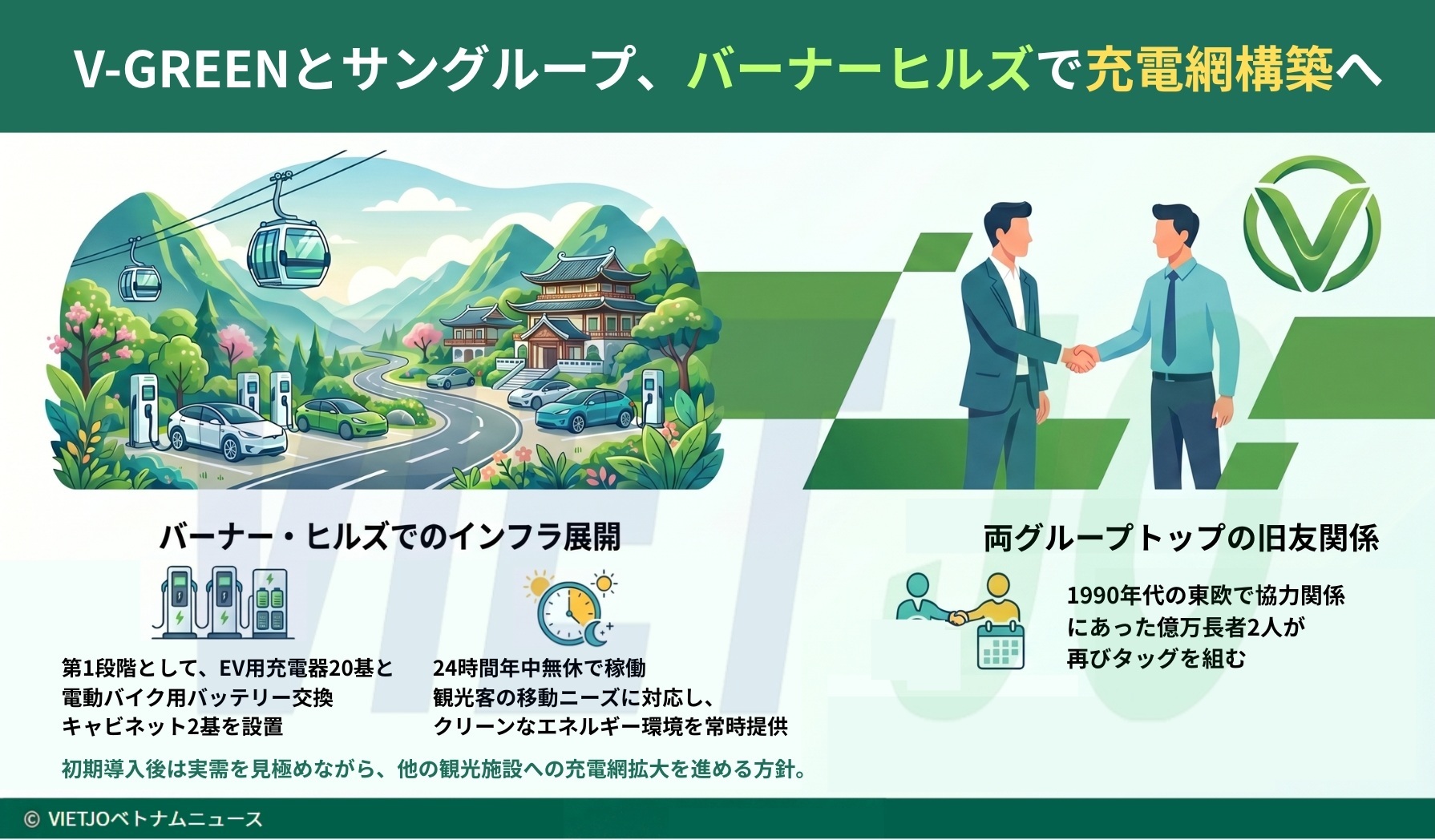 V-GREENは2024年3月にVIC会長のファム・ニャット・ブオン氏によって設立された。一方のバーナー・ケーブルカー・サービスは、サングループのレ・ベト・ラム会長を創立株主として2007年に設立された企業だ。