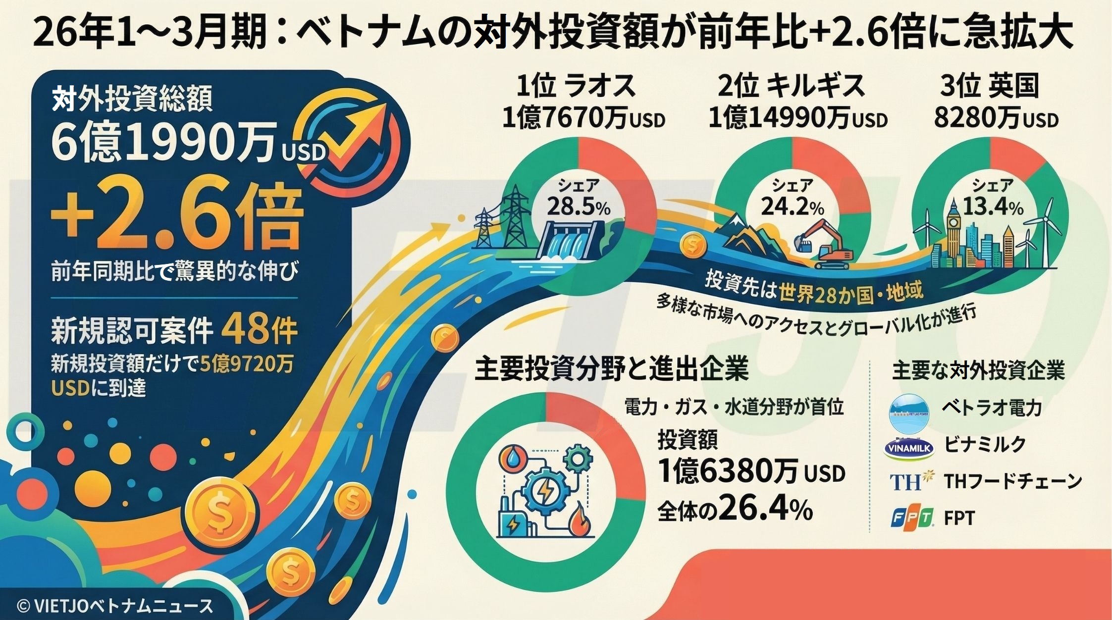 財政省傘下統計局(NSO)が発表したデータによると、2026年1~3月期のベトナムの対外投資総額(新規認可額と追加認可額の合計)は、前年同期比2.6倍の6億1990万USD(約990億円)に達した。