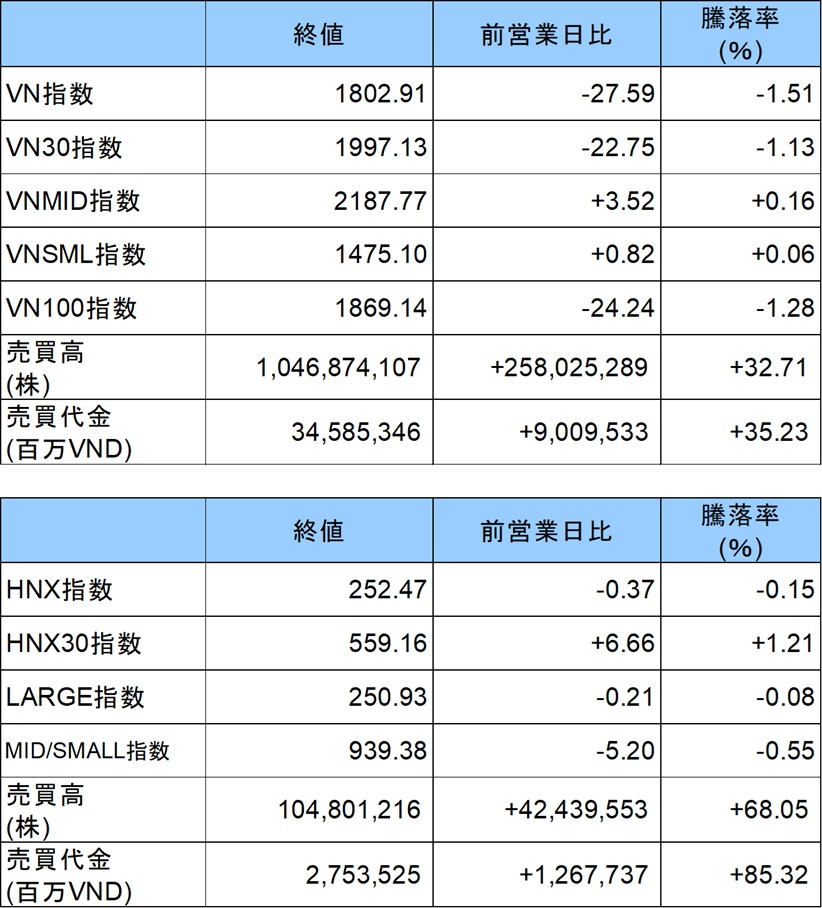 売買代金は34兆5853億VND(約2030億円)、前日比+35.2%増加した。主力株は値下がり銘柄が多く、中でもビングループ[VIC]がストップ安、ビンホームズ[VHM]、ベトナムゴム工業グループ[GVR]なども大幅安し、インデックスの重しになった。