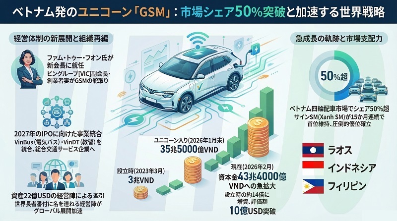 不動産開発を中核とする民間複合企業ビングループ[VIC](Vingroup)傘下のビンファスト(VinFast)製電気自動車(EV)・電動バイクのレンタカー・タクシー会社グリーン・スマート・モビリティ(GSM)は、VICのファム・ニャット・ブオン会長の妻であるファム・トゥー・フオン氏を新たな会長に任命した。