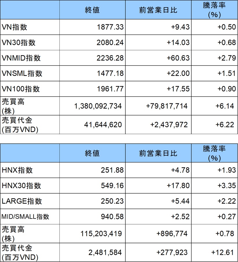 売買代金は41兆6446億VND(約2500億円)、前日比+6.2%増加した。主力株は値上がり銘柄が多く、インデックスをけん引した。