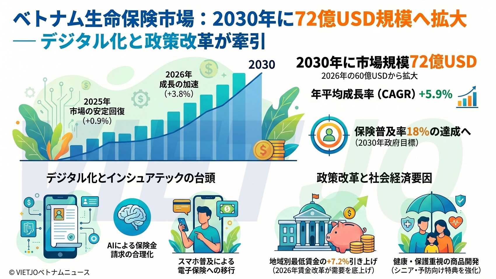 英国・ロンドンに本拠を置くデータ分析およびコンサルティング会社のグローバル・データ(GlobalData)が発表した最新のレポートによると、ベトナムの生命保険業界の保険料収入は、2026年の60億USD(約9500億円)から2030年には72億USD(約1兆1400億円)となり、年平均成長率(CAGR)+5.9%で拡大する見通しだ。