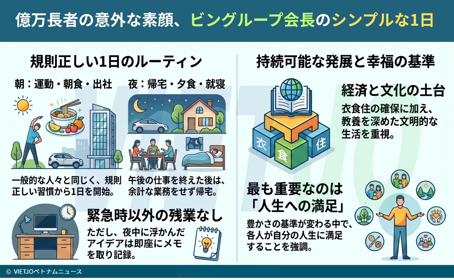 ベトナムで最も裕福な人物として知られる、不動産開発を中核とする民間複合企業ビングループ[VIC](Vingroup)のファム・ニャット・ブオン会長は、ハノイ市で22日に開かれた2026年の年次株主総会で自身の日常を明かし、その飾らないライフスタイルで多くの人々を驚かせた。