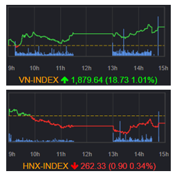 ホーチミン市場は1861.16(+0.01%)で小幅高に寄り付いた後、前場はもみ合いながら推移した。一時1859.04(▲0.10%)まで下落する場面もあったが、その後は買いが優勢となり持ち直した。後場に入ると上げ幅を拡大し、終盤に一時1882.17(+1.14%)まで上昇した。引けにかけてやや値を消したものの、VNインデックスは+18.73ポイント(+1.01%)高の1879.64の高値圏で引けた。